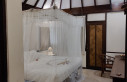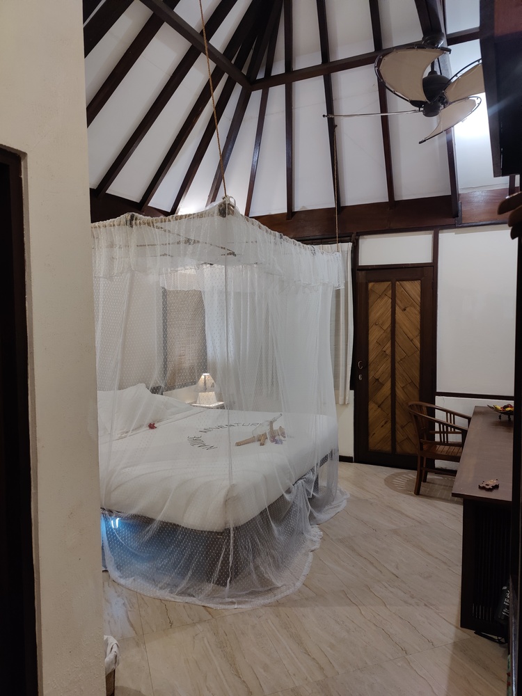 Zimmer sind gut ausgestattet mit schönen hohen Decken und Moskitonetz ums Bett, Klimaanlage und Deckenventilator vorhanden